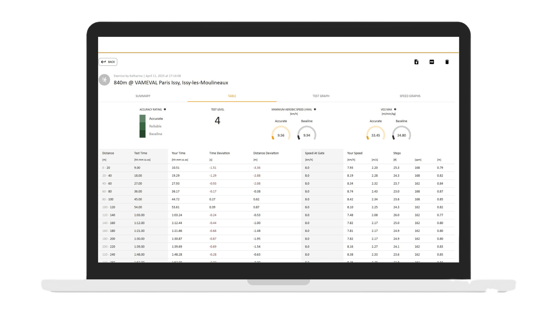 SmarTracks Online integration enhances your coaching experience by providing deeper insights into athlete performance. Once your session data is synced, you can access a range of advanced metrics, including Ground Contact Time (GCT) and other key running parameters. The app presents this data through various graphical displays and a detailed single-step table for precise analysis of each movement.